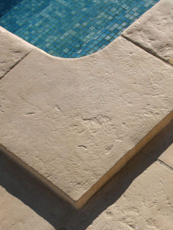 Du standard au sur-mesure : la margelle Manoir s’adapte au dessin des bassins les plus variés. La margelle droite, d’une longueur de 50 cm, de forme structurée et légèrement irrégulière, permet de confectionner avec quelques coupes des courbes et des bains romains de toutes dimensions.